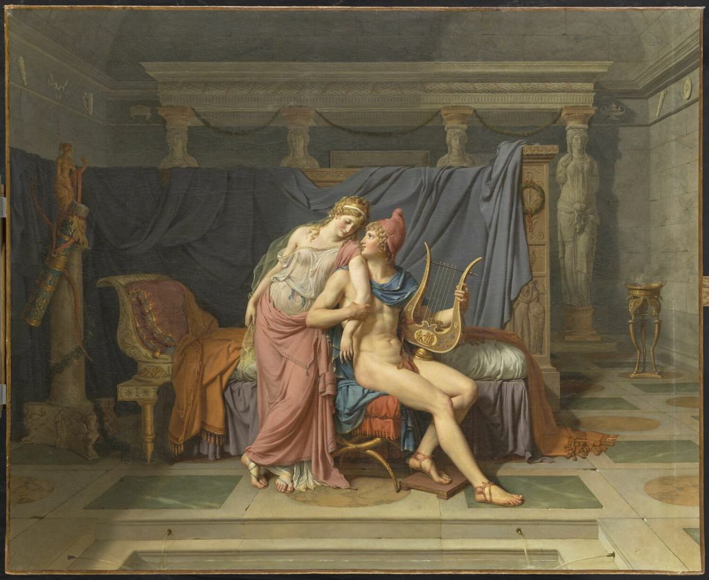 Why does this change how curators see this painting? To answer that we must look at the historical context. The Lavoisier’s were a couple that epitomized the ideals of the French Enlightenment in Parisian life. He, a well-respected chemist and she, an educated woman who was not only his partner in research but also and artist — a former student of David himself. The Lavoisier’s represented the dichotomy between the elite class of French society that benefited from the monarchy and the progressive thinking circles that led to the French Revolution. The original composition showed their elite standing in society while the portrait that we see today tones them down to be relatable. Their wealth status was diminished and their roles heighted. The scientific instruments for their research in chemistry and the portfolio in the background representing her as an artist. These contrasting images are important because the portrait was initially made on the eve of the French Revolution. It was supposed to be debuted at the 1788 Salon (in the Louvre) as a duet set with David’s painting of Paris and Helen of the Iliad.